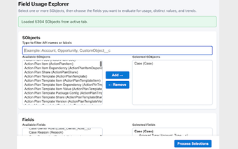 사용자는 분석을 위해 특정 sObjects 및 필드를 쉽게 선택할 수 있으며, '선택 처리' 버튼을 간단히 클릭하면 선택한 기준에 따라 자세한 통계를 표시하는 새 탭이 열립니다. 이 확장 프로그램은 개인 정보나 민감한 데이터를 처리하지 않고, 화면에 표시하기 위해 Salesforce에서 필요한 정보만 검색하여 사용자 개인 정보를 우선시합니다.
